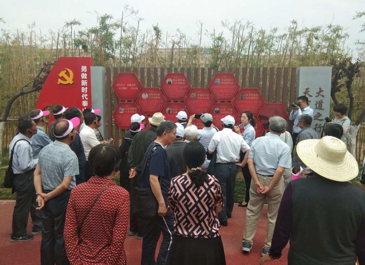 草木葱葱,庄严肃穆。在党章文化主题公园,解说员为大家介绍了公园的文化定位、主旨及近年来服务情况,全程详细讲解了公园“形象开篇、红色记忆、牢记誓言、党章历程、履行义务、保障权利、从严治党、不忘初心”等八个部分。公园以浮雕墙、主题雕塑、文化长廊和景观小品等为载体,充分展示党章内容和修订历程,具有浓厚的党章文化氛围。在共产党员誓言墙前,全体党员慷慨激昂地重温了入党誓词。退休党员辛国彬现场即兴赋诗一首:“握拳高举红旗前,入党誓言又耳畔。不忘初衷永前行,红色基因万代传。”在新时代泰山“挑山工”光荣墙上,荣登“中国好人榜”的81岁共产党员刘奉阁“活着一分钟,奉献六十秒”的先进事迹,令大家深受感动。