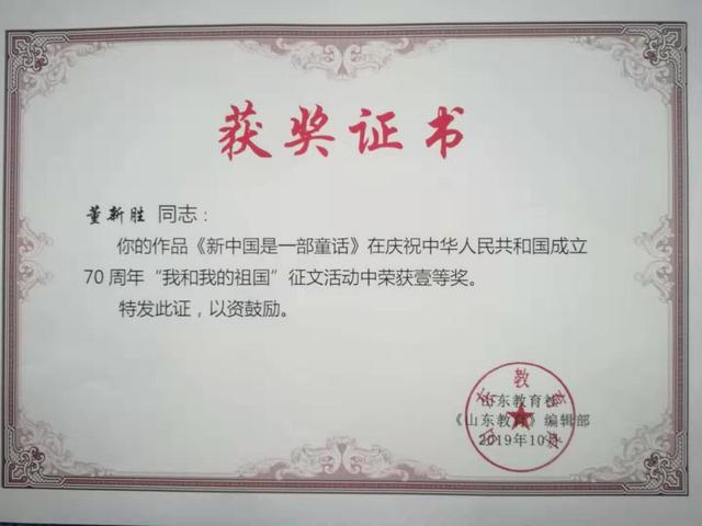 近日,由《山东教育》杂志举办的“我和我的祖国”庆祝中华人民共和国成立70周年征文活动落下帷幕。在省内外千余篇征文中,董新胜同志撰写的《新中国是一部童话》荣获一等奖,并被作为优秀获奖征文在《山东教育》(总第1085期)上刊发。这是我校唯一的获奖作品,也是全省高校唯一获此殊荣的离退休干部的作品。