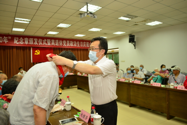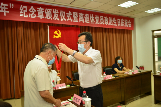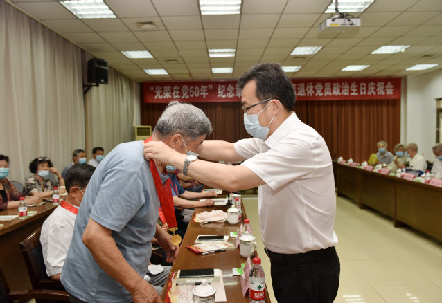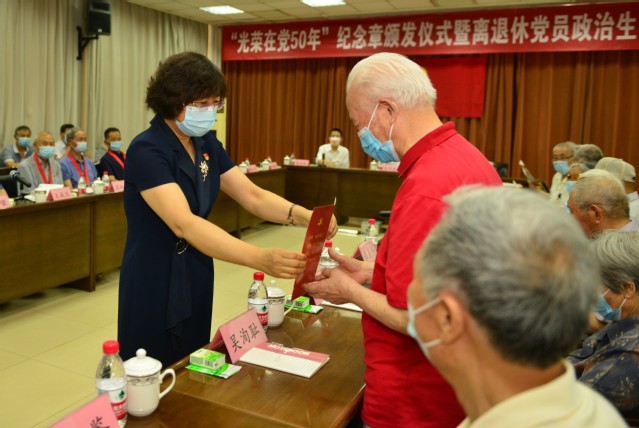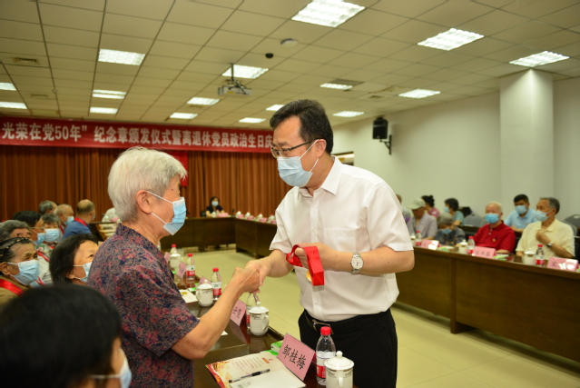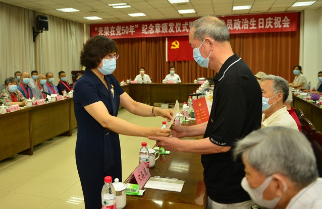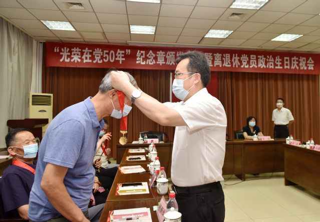党的第101个生日即将来临之际,6月23日,学校举行“光荣在党50年”纪念章颁发仪式暨离退休党员政治生日庆祝会,重温入党誓词,共忆初心使命。学校党委书记徐剑波、党委副书记朱莉出席会议,为参加活动的老党员逐一颁发纪念章,送上政治生日贺卡。党委常委、组织部部长岳远彬主持仪式。